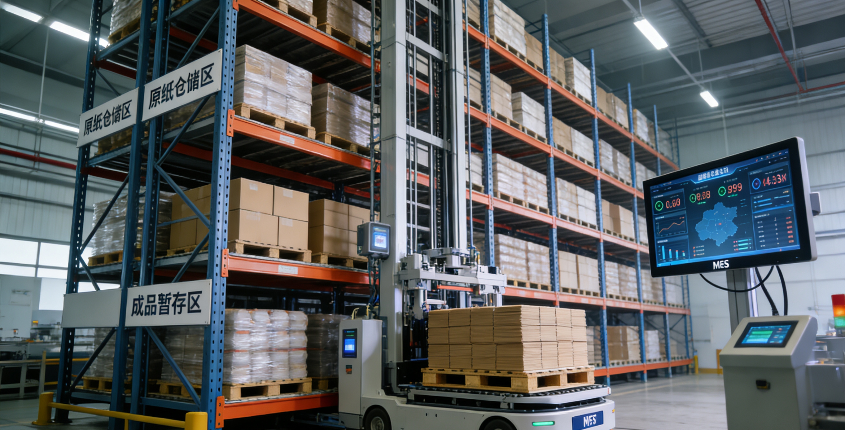仓储环节,风暴娱乐打造的2300平方米智能化立体仓库,以14.3米高6层货架提供3200余个托盘位,单位存储量达平库3倍。6台智能四向车与RCS中控系统协同,实现原纸自动化存取,出入库效率150卷/小时,残卷损耗率降至1.2%,年省仓储人力成本超80万元,库存周转天数压缩至22天。